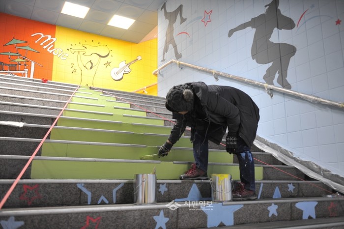 서울 노원구가 초등학생과 여고생들의 통학로로 이용되던 상계동 696번지 동일로 지하도를 아름다운 벽화길로 조성했다. 벽화는 해피한 봉사단 5명이 그렸으며 청소년들이 춤추고 노래하는 모습을 벽에 담았다. 사진은 벽화를 그리고 있는 봉사단원의 모습. (사진제공=노원구청)