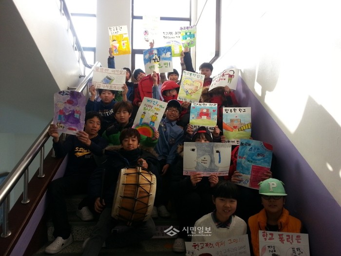 경기 부천시 부흥초등학교는 19일 5학년 학생을 대상으로 학교폭력 추방 캠페인을 실시했다. 학생들은 수업시간에 직접 만든 포스터를 들고 쉬는 시간마다 학교 복도를 돌며 구호를 외쳤다. 사진은 학생들이 포스터를 들고 기념촬영을 하고 있는 모습. (사진제공=부천교육지원청)