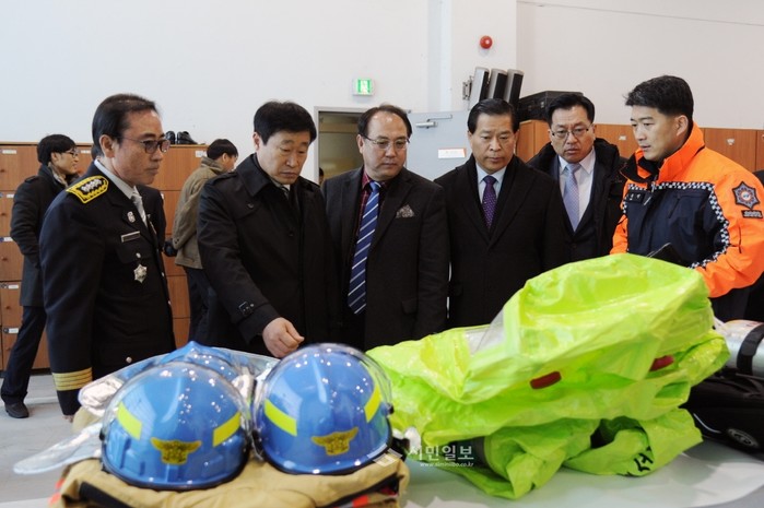 | ▲ 광진소방서를 방문환 박래학 의장을 비롯한 서울시의회 의원들이 관계자에게 소방 장비에 대한 설명을 듣고 있다. | ||