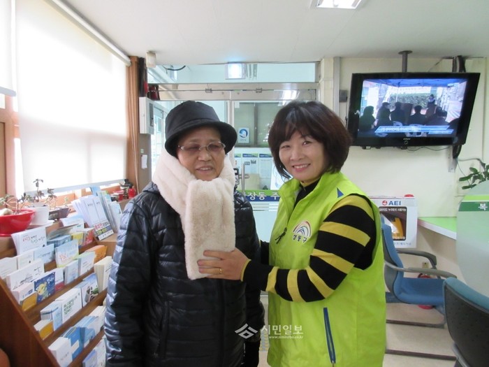 최근 서울 성동구 마장동 주민자치회 마을기업분과위원회 소속 ‘우리 마을 수수공방’ 회원들이 크리스마스를 맞아 직접 디자인해 만든 목도리를 동 주민센터에서 한 홀몸노인의 목에 둘러주고 미소짓고 있다.(사진제공=성동구청)