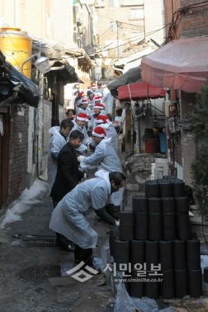 지난 20일 서울 중구 중림동에서 해군 OCS 장교중앙회 소속 사회봉사단이 후원한 연탄 전달식이 열린 가운데 이날 행사에 참석한 봉사단원들이 직접 연탄을 나르며 봉사활동을 펼치고 있다. (사진제공=중구청)