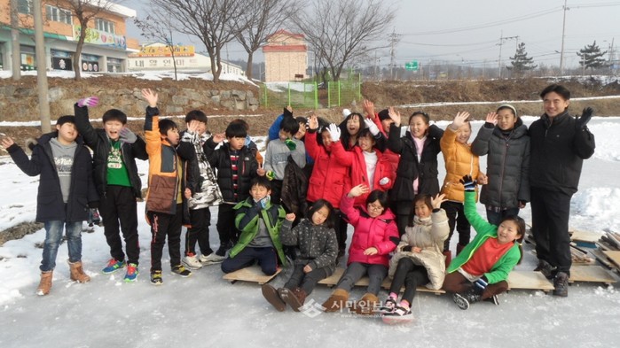 24일 경기 여주시 북내면은 초등학교 겨울방학에 맞춰 어린학생들의 겨울철 옛 놀이 문화 체험은 물론 어른들의 추억을 되살리는 계기를 마련코자 북내면 당우리 마을회관 앞에 얼음 썰매장을 개장했다. 사진은 이날 북내초등학교 학생들이 방문해 기념촬영 중인 모습. (사진제공=여주시청)