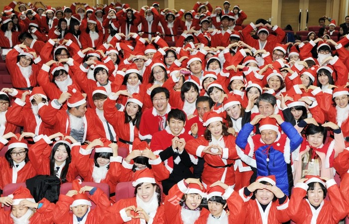 24일 경기 수원시종합자원봉사센터 주관으로 수원시청 대강당에서 열린 ‘2014 수원 사랑의 산타’ 행사에 참가한 염태영 수원시장이 참가자들과 함께 산타옷을 입고 포즈를 취하고 있다. (사진제공=수원시청)