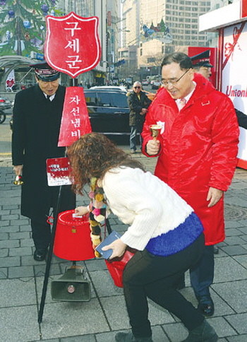 정홍원 국무총리가 24일 오후 서울 명동거리에서 구세군 자선냄비 성금 봉사를 하고 있다.