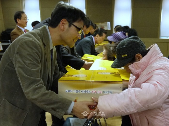 지난 23일 서울 서대문구 북아현동 주민센터 강당에서 북아현동 교동협의회 소속 교회 교인들이 성탄절을 맞아 십시일반 모은 후원금으로 생필품을 마련해 지역내 저소득 노인과 장애인 가정에 전달하고 있다. (사진제공=서대문구청)