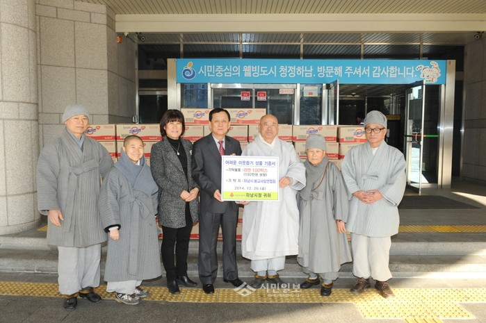 경기 하남시 불교사암연합회에서 연말 어려운 이웃을 위해 라면 100박스(180만원 상당)를 하남시에 기탁했다. 사진은 이날 시청을 방문한 불교사암연합회장 학명 스님(오른쪽 세 번째)과 이교범 하남시장(가운데) 및 관계자들이 기념촬영을 하고 있는 모습. (사진제공=하남시청)