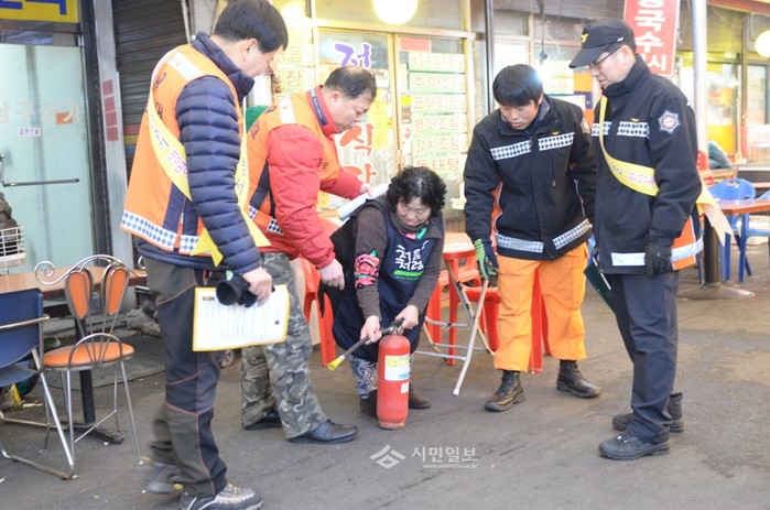 최근 서울 영등포소방서가 영등포 중앙시장에서 시장상인과 시장이용 고객들을 대상으로 화재가 발생했을 때 초기대응능력을 키우기 위해 소화기, 비상소화장치 사용법 등의 내용으로 구성된 '화재예방캠페인'을 실시했다. 사진은 캠페인에서 소화기 교육법을 배우는 시장 상인의 모습. (사진제공=영등포소방서)