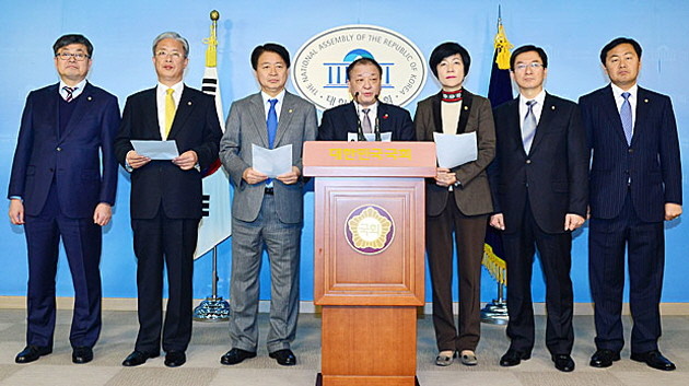26일 오후 서울 여의도 국회에서 새정치민주연합 빅3(문재인, 정세균, 박지원) 전당대회 불출마 촉구 모임 소속 의원들이 정세균 의원의 전대 불출마 선언과 관련 기자회견을 하고 있다. 왼쪽부터 최원식·유성엽·노웅래·강창일·김영주·정성호·김관영 의원.