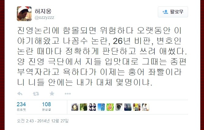 [시민일보=서예진 기자] 영화평론가 겸 방송인 허지웅이 영화 '국제시장'과 관련, "토가 나온다"는 발언에 대해 "홍어 좌빨이라니. 니들 안에 내가 대체 몇명이냐"고 불편한 심경을 드러냈다.