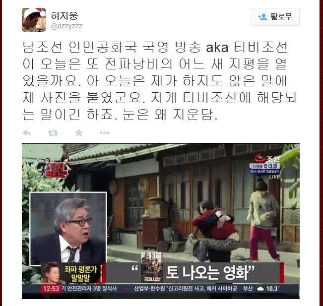 그러자 TV조선에서 해당 발언을 부각해 논란이 되자 허지웅은 자신의 트위터를 통해 "남조선 인민공화국 국영 방송 aka 티비조선이 오늘은 또 전파낭비의 어느 새 지평을 열었을까요. 아 오늘은 제가 하지도 않은 말에 제 사진을 붙였군요. 저게 티비조선에 해당하는 말이긴 하죠"라고 날선 반응을 보였다.