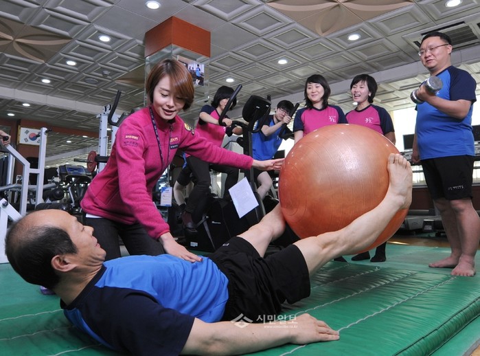 | ▲ '뱃살줄이기 프로젝트'에 참가한 직원들이 맞춤형 운동관리를 받고 있다.(사진제공=중구청) | ||