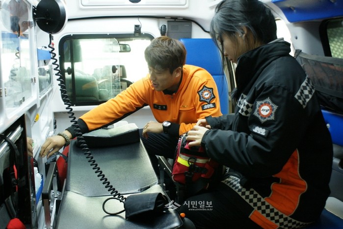 인천공단소방서는 최근 응급구조학과생의 응급처치 능력 함양과 긴급구조 인프라 구축을 위해 가천대학교 응급구조학과 4학년 학생 6명을 대상으로 구급활동 현장실습을 실시했다. 사진은 응급처치 장비 조작과 처치요령 등을 배우고 있는 학생의 모습. (사진제공=인천공단소방서)
