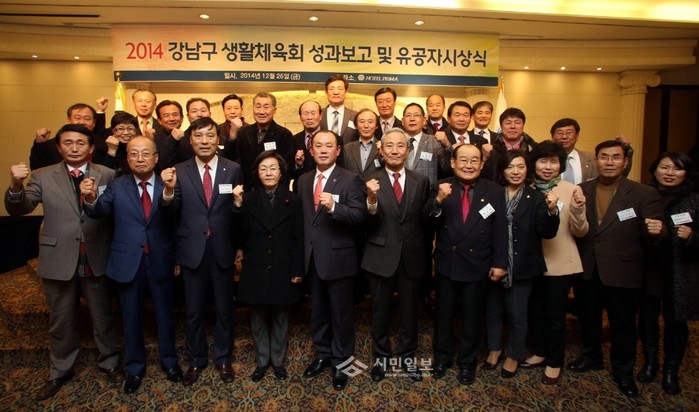 지난 26일 서울 강남구 프리마호텔에서 열린 ‘2014년 강남구 생활체육회 성과보고회’에 참석한 신연희 강남구청장(앞열 왼쪽에서 4번째)이 김종훈 국회의원(앞열 왼쪽에서 6번째) 및 관계자들과 함께 '파이팅'을 외치고 있다.(사진제공=강남구청)