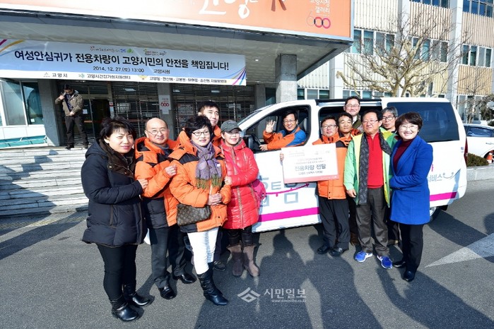 지난 27일 경기 고양시가 여성들의 심야시간 안전한 귀가를 돕기 위해 고양동·관산동·고봉동·탄현동·송산동에서 오는 2015년부터 실시할 '고양시 여성안심귀가 동행 홈투홈 서비스'에 사용할 차량전달식을 열었다. 사진은 전달식에 참여한 관계자들과 차량의 모습.(사진제공=고양시청)