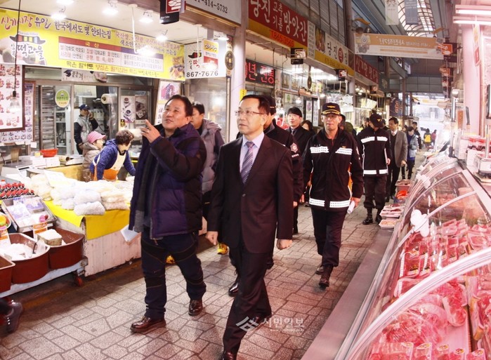 29일 정문호 인천소방안전본부장(사진 오른쪽)이 연말연시를 맞아 인천 남구에 위치한 신기시장을 소방 관계자들과 함께 방문해 시장상인들에게 화기취급에 주의할 것을 당부하고 시장내부 시설을 살피고 있다. (사진제공=인천소방안전본부)