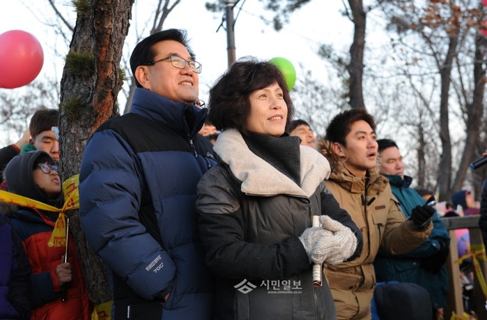 1일 서울 동대문구는 배봉산 전망대에서 을미년 새해를 맞아 해맞이 행사를 개최했다. 새해 해맞이의 새로운 명소로 떠오르고 있는 배봉산에는 행사 당일 오전 8시5분부터 일출이 시작돼 장관을 연출했다. 사진은 배봉산 해맞이 행사 새해소원을 비는 유덕열 동대문구청장 부부의 모습. (사진제공=동대문구청)