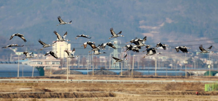재두루미 모습을 담은 사진작가 최종수씨는 "해마다 100~200여마리의 재두루미가 월동하는 정도였는데 지난해 12월부터 개체수가 늘어 지금은 약 300여마리로 증가했다"며 "주남저수지에 재두루미 개체수가 늘어난 것은 우리나라 최대 월동지인 철원지역이 폭설로 먹이찾기가 곤란해지면서 일부가 남하한 것으로 파악된다"고 설명했다.