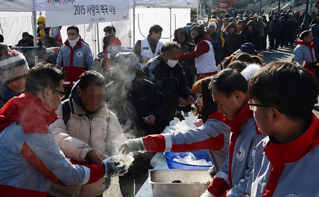 2일 서울역 광장에서 열린 대한적십자사 떡국나눔 시무식에서 적십자 임직원과 봉사원들이 노숙인 및 독거노인들에게 500인분의 떡국을 나눠주고 있다. 대한적십자사는 이날 새해 첫 시작을 알리는 시무식을 전국 14개 시.도 지역에서 임직원 및 봉사원 1,000여 명이 참여하는 떡국 나눔 봉사활동으로 진행했다.