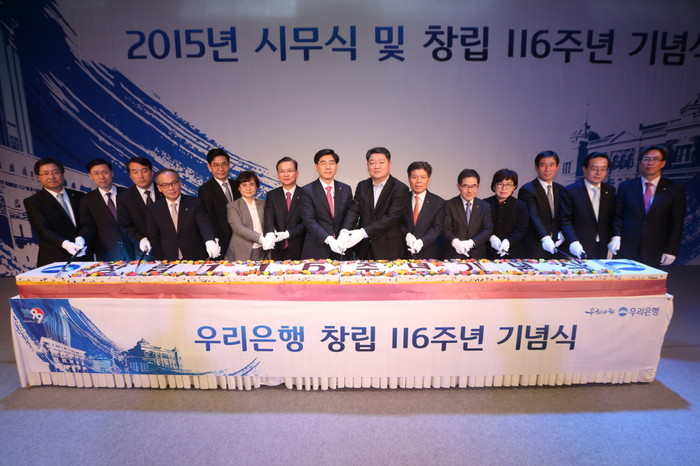 | ▲ 2일 우리은행 본점에서 열린 창립 116주년 기념식에서 이광구 은행장(사진 왼쪽 8번째)와 박원춘 노조위원장(사진 왼쪽 9번째)를 비롯한 임원들이 케익커팅을 하고 있다 | ||