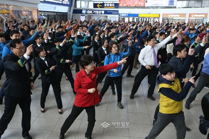 코레일은 지난 3일 서울역 맞이방에서 코레일 고객과 직원 등 300여명이 함께 참여하는 '기차놀이 플래시몹'을 진행했다. 사진은 최연혜 코레일 사장을 비롯해 서울역을 찾은 고객과 직원들이 기차를 주제로 한 흥겨운 음악에 맞춰 함께 율동을 하는 모습. (사진제공=코레일)