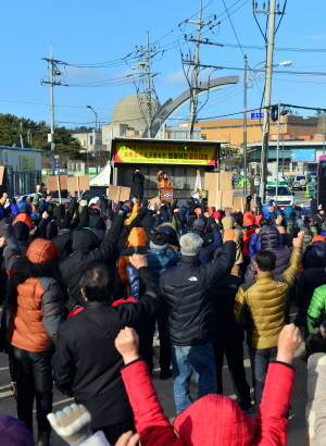 6일 오전 전남 영광군 홍농읍 한빛원자력발전소 정문 앞에서 영광지역 주민 500여명이 '처리 대책 없는 한빛원전 3호기 폐원자로헤드 교체 중지 촉구 집회'를 열고 있다