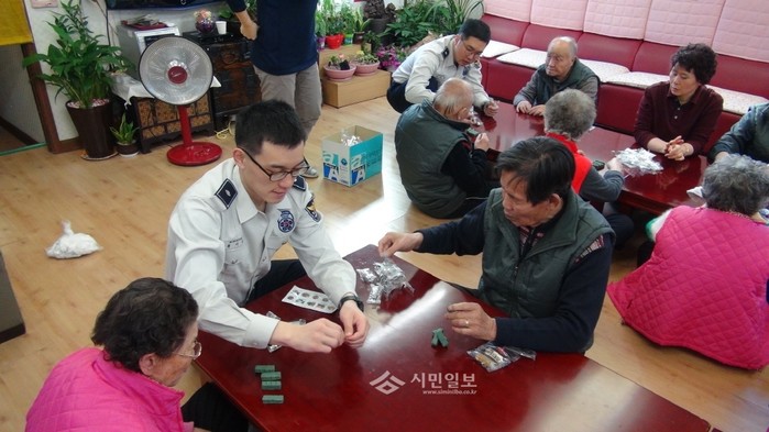 지난 6일 인천 중부경찰서 방범순찰대는 중구 전동에 위치한 치매보호센터 금빛사랑채를 방문해 치매노인들의 식사를 돕고 목욕봉사, 그림치료 활동을 보조하는 봉사활동을 실시했다. 사진은 봉사활동 중인 방범순찰대원들의 모습. (사진제공=중부경찰서)