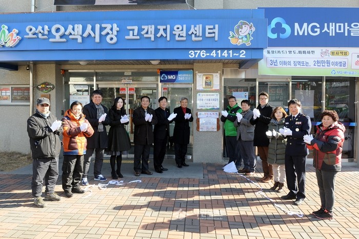 지난 7일 경기 오산시는 지역내 전통시장인 오산오색시장에서 '우수전통시장 인증 현판식'을 열었다. 사진은 오색시장 고객지원센터 앞에서 열린 이번 현판식에 참석한 곽상욱 오산시장과 시장 상인 등 관계자들이 기념촬영을 하는 모습. (사진제공=오산시청)