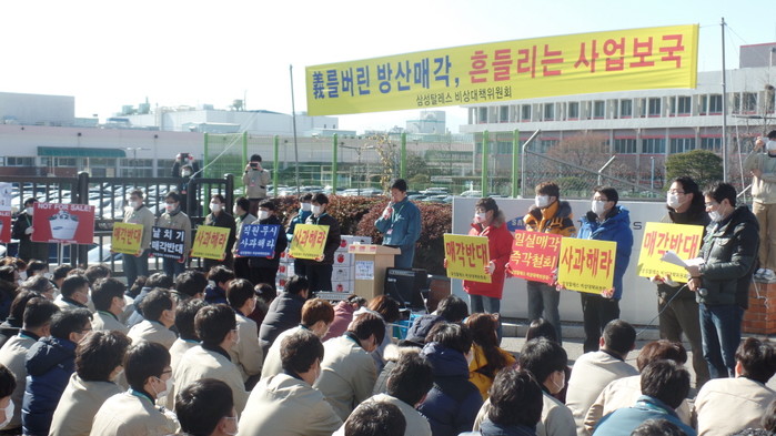 그룹 간의 '빅딜'로 한화그룹에 매각이 결정된 삼성탈레스 경북 구미사업장 근로자들이 지난 6일 회사 정문 앞에서 '밀실매각 반대'를 외치며 집회를 열고 있다.