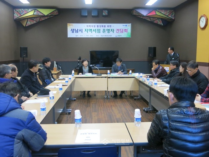 경기 성남시 공공도서관이 7일 중앙도서관에서 개최한 '성남시 지역서점 운영자 간담회'에 참가한 평생학습과장, 도서관지원과장, 15개 지역 서점 운영자 등이 공공도서관의 책 구매방식에 대해 토론하고 있다. (사진제공=성남시청)