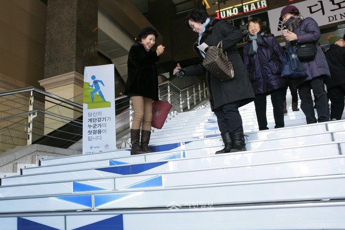 서울 성동구는 생명보험사회공헌재단, 비트플렉스와 함께 왕십리 민자역사에 건강기부계단을 설치했다. 이 계단은 5.7kcal의 열량이 소모되고 건강수명이 약 3분 증가하는 효과가 있다. 사진은 건강계단을 걷고 있는 시민들의 모습. (사진제공=성동구청)