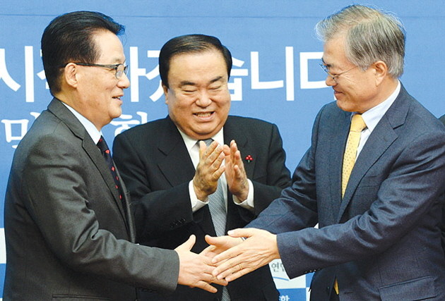 8일 오전 서울 여의도 국회 새정치민주연합 당대표실에서 열린 ‘공명선거실천협약식’에서 당 대표에 출마한 박지원(왼쪽), 문재인 후보(오른쪽)가 문희상 비대위원장이 박수를 치는 가운데 손을 맞잡으며 웃고 있다.