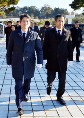 새정치민주연합 당대표 후보 이인영 의원이 김승남 의원과 함께 8일 오전 광주 북구 운정동 국립5.18민주묘지를 둘러보고 있다.