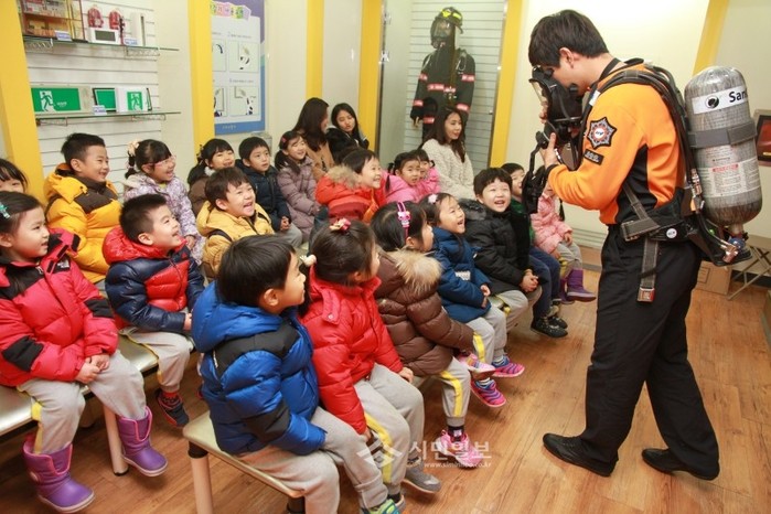 9일 서울 구로소방서 3층 소방안전체험교실에서 구로구 경인로에 위치한 아이슐레유치원 원생 및 지도교사 등이 ‘꾸러기 소방관’ 체험학습의 일환으로 소방관으로부터 소방장비 설명을 듣고 있다. (사진제공=구로소방서)