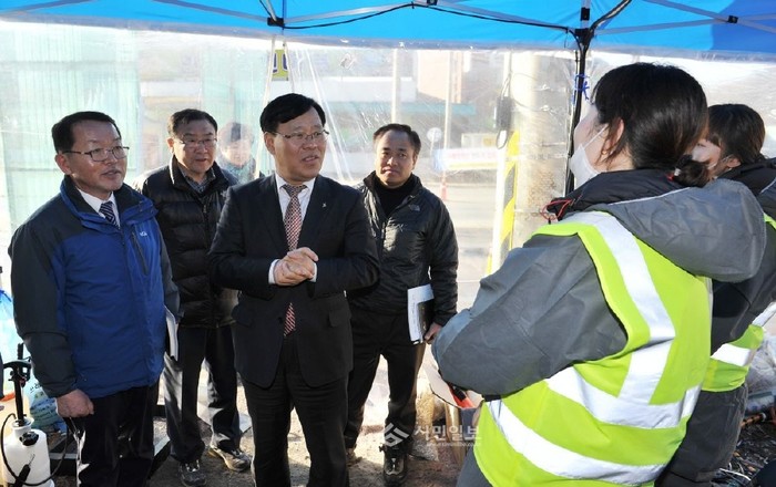 지난 9일 박덕순 광주시 부시장은 광주시 곤지암읍 열미리에 위치한 구제역 방역 거점소독시설을 방문해 방역 현장을 점검하고 방역을 위해 힘쓰고 있는 근무자들을 격려했다. 사진은 박 부시장이 관계공무원들과 함께 현장을 둘러보고 있는 모습. (사진제공=광주시청)