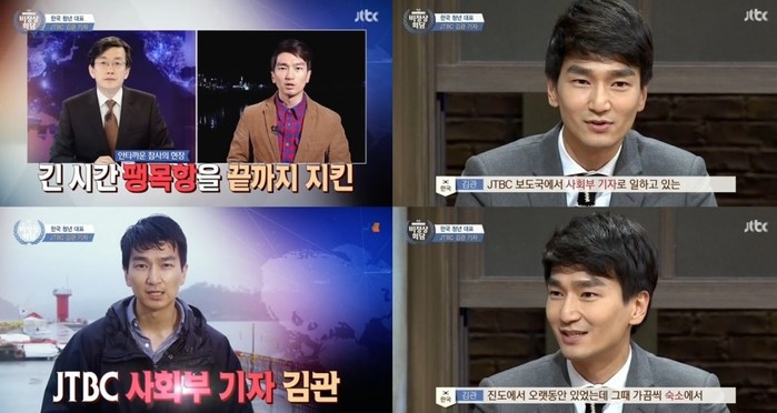 JTBC 김관 기자는 지난해 4월 발생한 세월호 사고 당시 진도에 오래 머물면서 안타까운 참사의 현장을 지속적으로 취재해 얼굴을 알리게 됐다. 특히 손석희 앵커는 "김관 기자 대신 다른 기자를 보낼까 생각했다. 하지만 유족들이 반대해 김관 기자는 진도 팽목항에서 취재를 계속하게 됐다"고 설명한 바 있다.