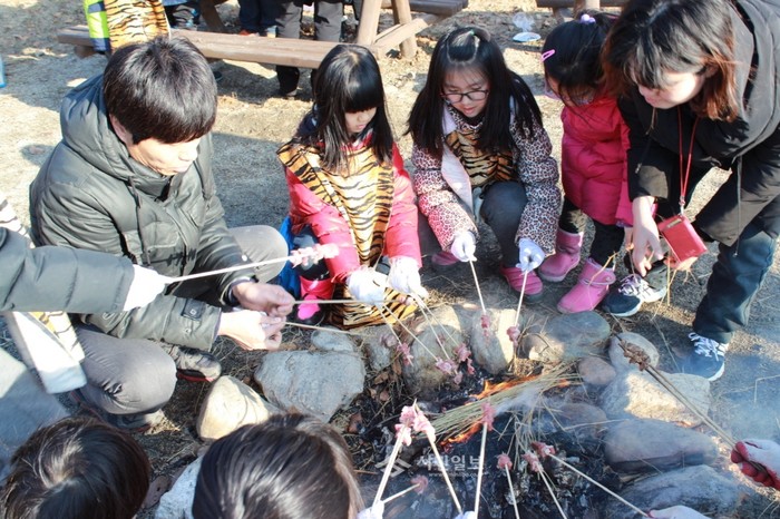 서울 강동구가 방학을 맞아 어린이들이 선사생활에 대해 배우고 체험할 수 있도록 돕기 위해 암사동 선사유적지에서 '선사인의 겨울나기', '가족이 함께하는 선사시대 겨울생활' 프로그램을 운영 중이다. 사진은 최근 프로그램에 참여한 어린이들이 원시화덕에 고기·고구마 등을 구워먹는 모습.(사진제공=강동구청)