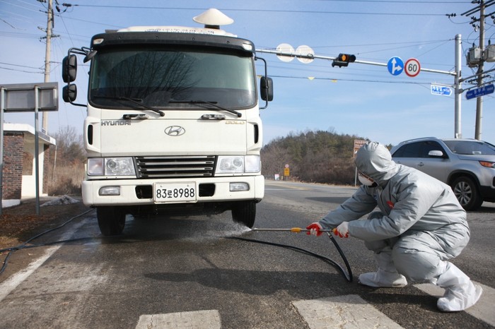 13일 추가 구제역이 발생한 경북 의성군 금성면 진입도로에서 방역당국이 축산 차량에 대해 소독을 실시하고 있다.