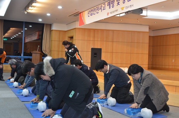 서울 강남소방서가 13일 강남우체국에서 우체국 직원을 대상으로 소방안전망 구축을 위한 '소·소·심 교육'을 실시했다. 사진은 참여 우체국 직원들이 응급환자가 발생했을 때 대처능력을 높이기 위한 심폐소생술 교육을 받는 모습.(사진제공=강남소방서)