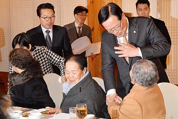 정의화 국회의장이 13일 낮 서울 여의도 의원 동산 사랑재에서 위안부 할머니들을 초청 오찬에 앞서 할머니 손을 잡아주며 격려하고 있다.
