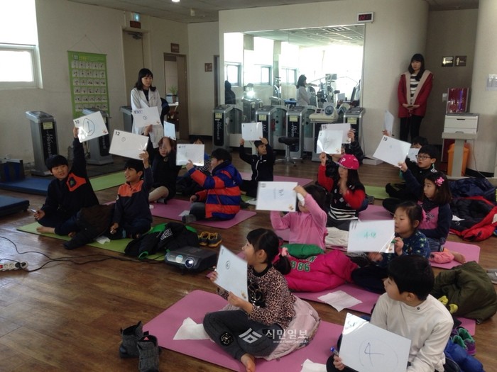 인천 동구가 최근 체험을 통한 교육으로 건강의 중요성을 알게하고자 '어린이와 청소년을 위한 건강캠프'를 실시했다. 사진은 어린이들이 보건소 건강증진센터에서 진행된 '도전 건강벨' 게임에 참여해 문제를 풀고 있는 모습. (사진제공=동구청)