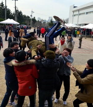 13일 오후 광주 북구 제31 보병사단 신병교육대대에서 2015년 광주전남지역 첫 입영식이 열린 가운데 친구들이 군대가는 친구에게 헹가래를 하고 있다.
