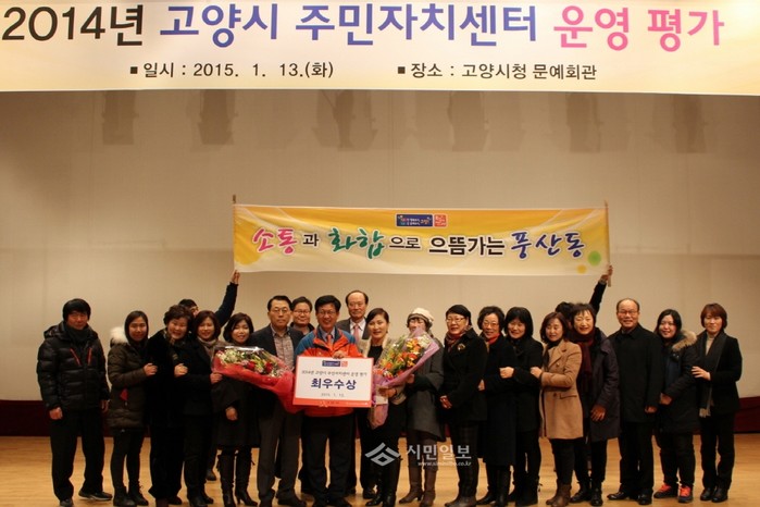 경기 고양시는 13일 시청 문예회관에서 '2014년도 고양시 주민자치센터 운영 최종 평가'를 실시해 2014년을 빛낸 우수 주민자치센터 최우수상에 풍산동 주민자치센터 등 7곳을 선정했다. 사진은 최우수상을 받은 풍산동 주민자치센터 관계자들과 최성 시장(가운데)이 기념촬영을 하는 모습. (사진제공=고양시청)