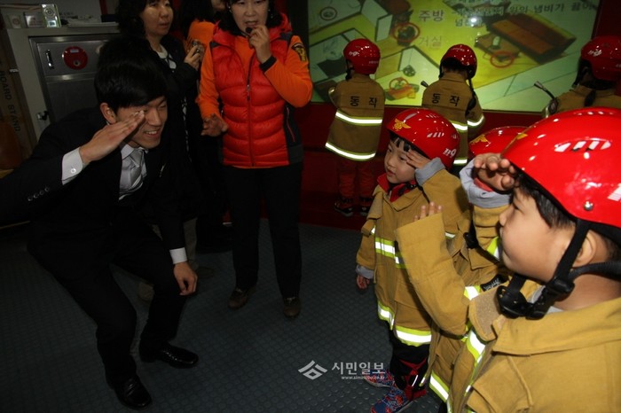 서울 동작소방서가 14일 동작소방서 3층 안전체험교실에서 신규임용 소방대원과 동광어린이집 원생을 대상으로 소화기 사용 및 연기대피 체험을 실시했다. 사진은 소방안전체험에 참여한 어린이들이 신규임용 소방대원과 함께 경례를 하는 모습. (사진제공=동작소방서)