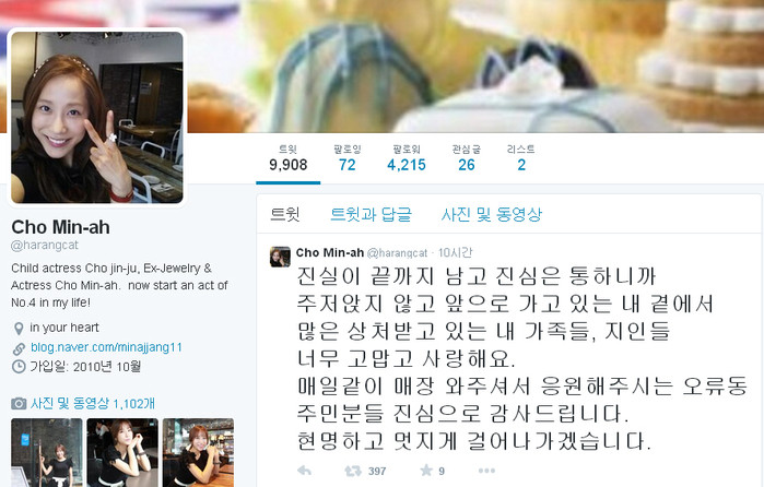 특히, 조민아는 트위터틑 통해 가족과 지인들에게 사랑한다는 말을 전해 눈길을 끌었다.