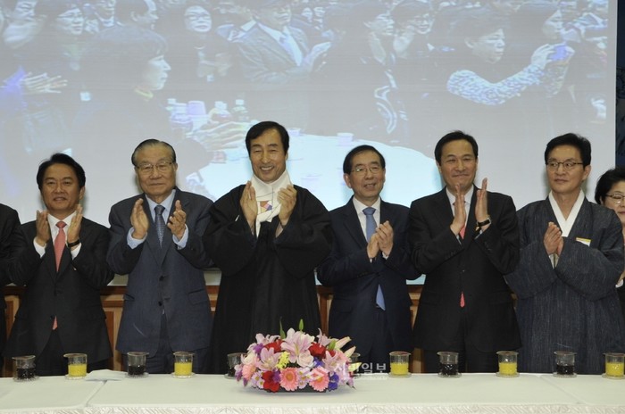지난 14일 서울 서대문구 구청 대강당에서 열린 2015 신년인사회에 참석한 장재식 전 산업자원부장관, 문석진 구청장, 박원순 서울시장, 우상호·전두원 국회의원(오른쪽 두번째부터)이 박수를 치고 있다. (사진제공=서대문구청)