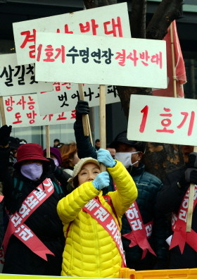 15일 오전 서울 종로구 원자력안전위원회 앞에서 열린 노후원전 월성 1호기 수명연장 중단 촉구 기자회견에서 월성주민들이 '월성원전 1호기 폐쇄'를 촉구하는 구호를 외치고 있다.