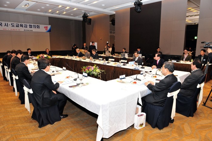 이재정 경기도교육감은 지난 15일 오후 전북 남원 스위트호텔에서 열린 '전국 시·도교육감협의회'에 참석했다. 이날 참석한 전국의 시·도교육감들이 현안을 놓고 회의하고 있는 모습. (사진제공=경기도교육청)