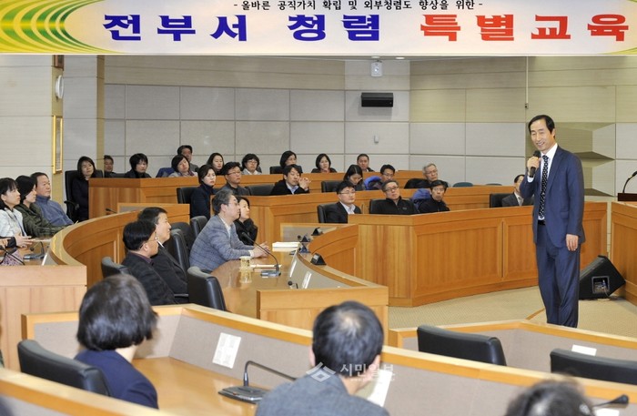 지난 13일 문석진 서울 서대문구청장이 릴레이 특강의 일환으로 인허가 관련 부서 공무원 60여명을 대상으로 구청 회의실에서 청렴의식을 높이고 실천의지를 다지기 위한 청렴특강에 나서 강연을 펼치고 있다. (사진제공=서대문구청)