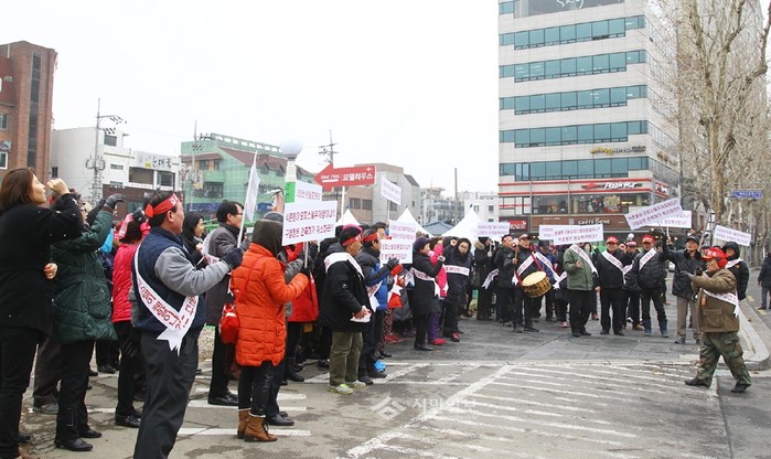 | ▲ 지난 16일 석촌동 백제고분에서 열린 ‘석촌호수 주변 오피스텔 건립 반대집회’에 참여한 주민들이 건축허가 취소 문구가 담긴 피켓을 들고 항의 시위를 펼치고 있다. | ||