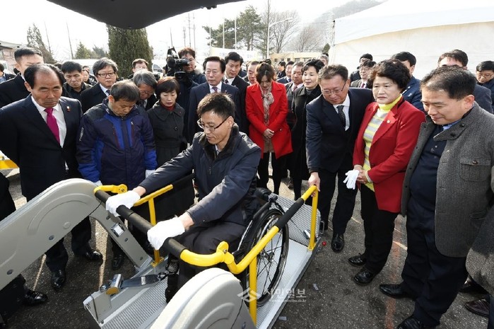 경기 광주시는 20일 광주공공하수처리장내 이동지원센터(광주희망콜)를 설치하고 '광주시 교통약자 이동지원센터(광주희망콜) 발대식'을 개최했다. 사진은 발대식 중 특수차량 시승체험식을 지켜보는 조억동 광주시장 및 장애인단체장 등 관계자들의 모습. (사진제공=광주시청)